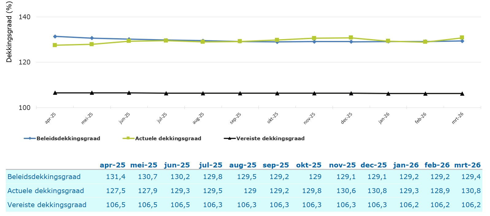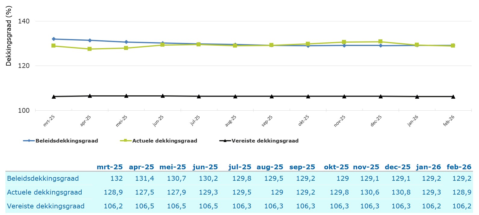 De actuele dekkingsgraad (groene lijn) is in februari gedaald ten opzichte van januari van 129,3% naar 128,9%. De beleidsdekkingsgraad (blauwe lijn) is gelijk gebleven op 129,2%. De beleidsdekkingsgraad is een gemiddelde van de twaalf voorafgaande actuele dekkingsgraden.